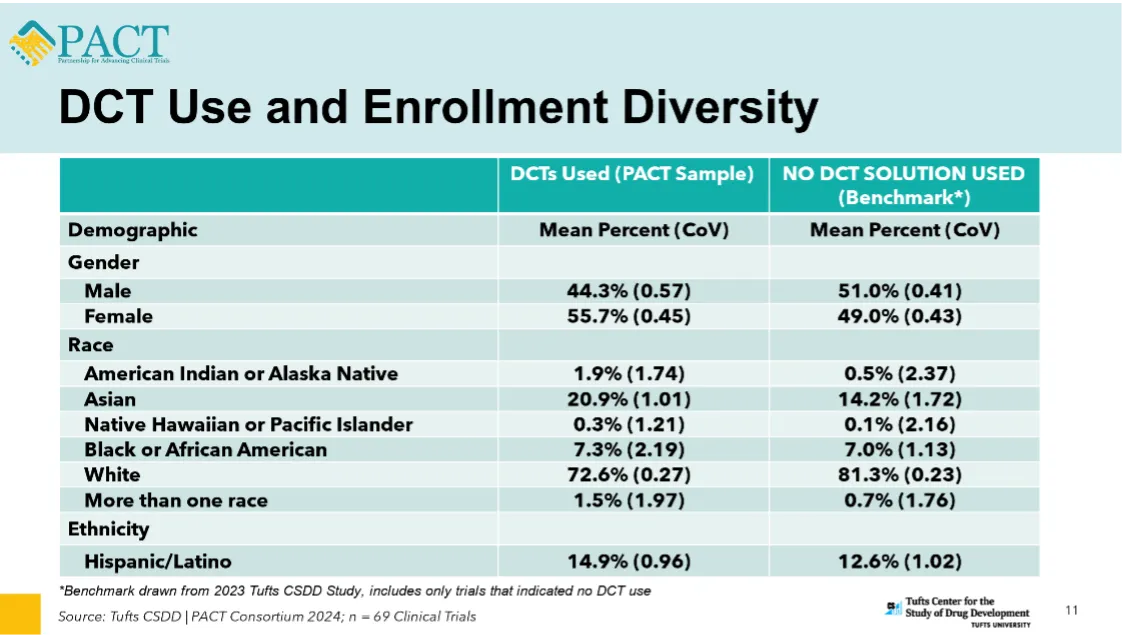 PALO ALTO, Calif. – January 28, 2025 – Medable Inc., a leading provider of clinical development technology, today announced new data from the Tufts Center for the Study of Drug Development (CSDD)’s PACT Consortium linking decentralized clinical trial (DCT) approaches to notably higher proportional representation among select demographic subgroups. The new research suggests that more strategic implementation of DCT approaches in conjunction with more rigorous planning may meaningfully improve diversity in clinical trials.